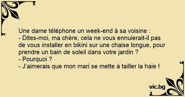 - Dites-moi, ma chère, cela ne vous ennuierait-il pas de vous installer en bikini sur une chaise longue, pour prendre un bain de soleil dans votre jardin ?