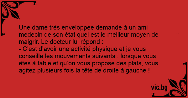Une dame très enveloppée demande à un ami médecin de son état quel est le meilleur moyen de maigrir. Le docteur lui répond :