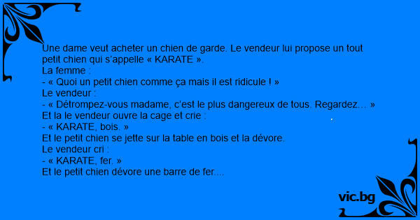 Une dame veut acheter un chien de garde. Le vendeur lui propose un tout petit chien qui s’appelle « KARATE ».