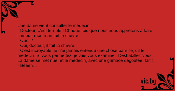 - Docteur, c’est terrible ! Chaque fois que nous nous apprêtons à faire l’amour, mon mari fait la chèvre.