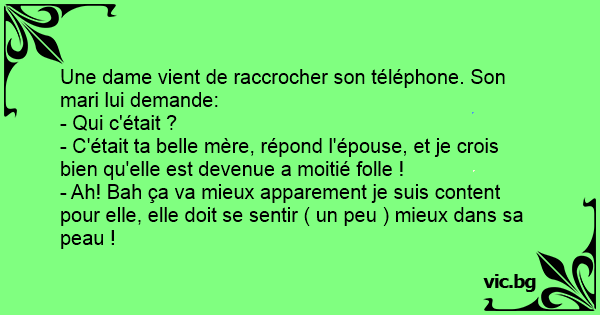 - C'était ta belle mère, répond l'épouse, et je crois bien qu'elle est devenue a moitié folle !