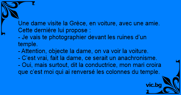 Une dame visite la Grèce, en voiture, avec une amie. Cette dernière lui propose :