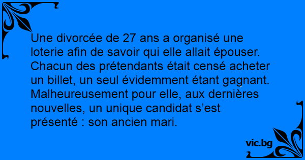 Une divorcée de 27 ans a organisé une loterie afin de savoir qui elle allait épouser. Chacun des prétendants était censé acheter un billet, un seul évidemment étant gagnant. Malheureusement pour elle, aux dernières nouvelles, un unique candidat s’est présenté : son ancien mari.