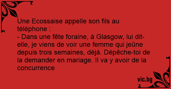 - Dans une fête foraine, à Glasgow, lui dit-elle, je viens de voir une femme qui jeûne depuis trois semaines, déjà. Dépêche-toi de la demander en mariage. Il va y avoir de la concurrence