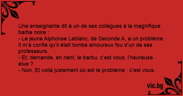 - Le jeune Alphonse Leblanc, de Seconde A, a un problème. Il m’a confié qu’il était tombé amoureux fou d’un de ses professeurs.