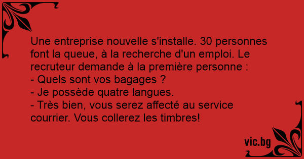 Une entreprise nouvelle s'installe. 30 personnes font la queue, à la recherche d'un emploi. Le recruteur demande à la première personne :