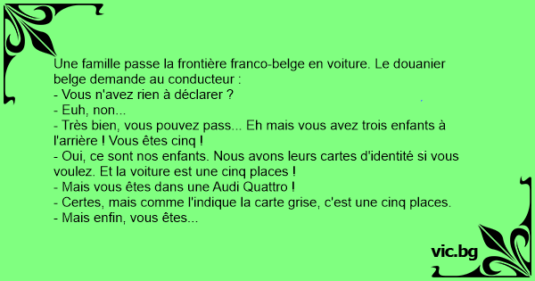 Een man in een auto wordt aangehouden bij de Belgische grens. "Meneer, u kunt de grens niet over," zegt de Belgische douanier, "want u rijdt in een Audi Quattro en u zit er maar in uw eentje in."...