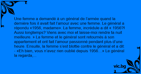Une femme a demandé à un général de l’armée quand la dernière fois il avait fait l’amour avec une femme. Le général a répondu «1956, madame». La femme, incrédule a dit « 1956?! Aussi longtemps? Viens avec moi et laisse-moi rendre ta nuit meilleure. » La femme et le général sont retournés à son appartement et ont fait l’amour passionné pendant plus d’une heure. Ensuite, la femme s’est blottie contre le général et a dit: