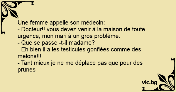 - Docteur!! vous devez venir à la maison de toute urgence, mon mari à un gros problème.