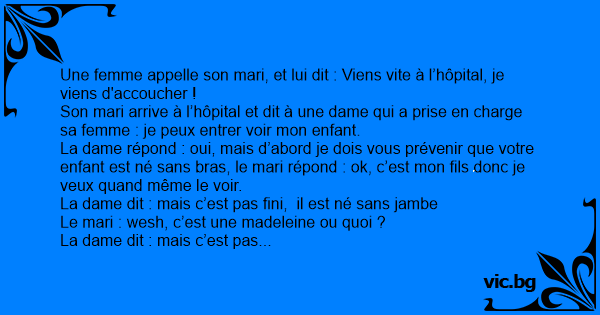 Une femme appelle son mari, et lui dit : Viens vite à l’hôpital, je viens d'accoucher !