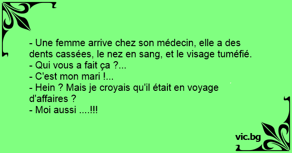 Een vrouw komt bij de dokter, met gebroken tanden, de nek vol bloed en een blauw gezicht. Vraagt de dokter: Wie heeft je dat aangedaan? Antwoordt het vrouwtje: Het komt van mijn echtgenoot! Hoezo,...
