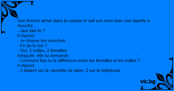 Assis à table, un homme s'amuse à tuer les mouches qui se trouvent près de lui. Sa femme, etonnée lui demande: - Mais que fais tu? - Je tue les mouches, j'en ai déjà tué 8, 5 mâles et 3 femelles. -...