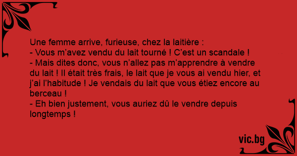 - Mais dites donc, vous n’allez pas m’apprendre à vendre du lait ! Il était très frais, le lait que je vous ai vendu hier, et j’ai l’habitude ! Je vendais du lait que vous étiez encore au berceau !