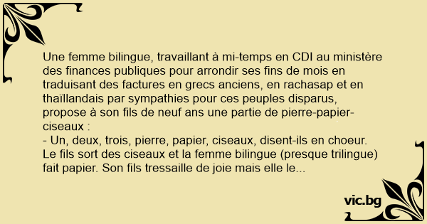 Une femme bilingue, travaillant à mi-temps en CDI au ministère des finances publiques pour arrondir ses fins de mois en traduisant des factures en grecs anciens, en rachasap et en thaïllandais par sympathies pour ces peuples disparus, propose à son fils de neuf ans une partie de pierre-papier-ciseaux :