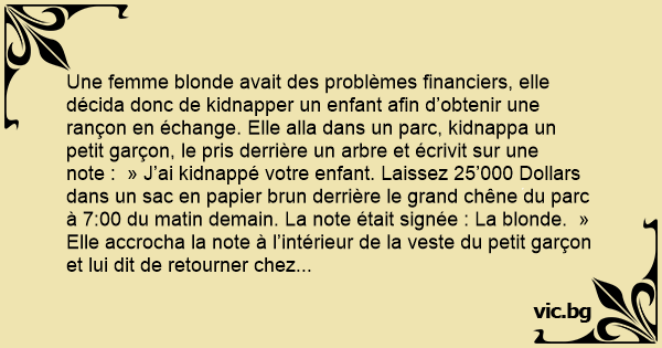 Une femme blonde avait des problèmes financiers, elle décida donc de kidnapper un enfant afin d’obtenir une rançon en échange. Elle alla dans un parc, kidnappa un petit garçon, le pris derrière un arbre et écrivit sur une note : » J’ai kidnappé votre enfant. Laissez 25’000 Dollars dans un sac en papier brun derrière le grand chêne du parc à 7:00 du matin demain. La note était signée : La blonde. »