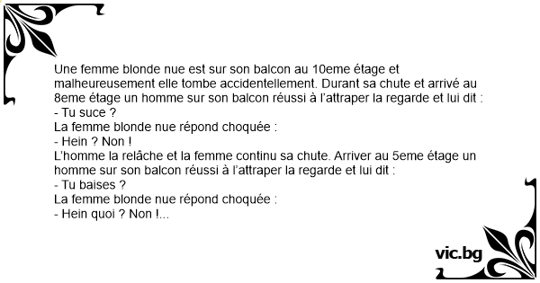 Une femme blonde nue est sur son balcon au 10eme étage et malheureusement elle tombe accidentellement. Durant sa chute et arrivé au 8eme étage un homme sur son balcon réussi à l’attraper la regarde et lui dit :