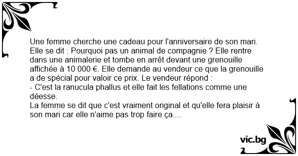 Une femme cherche une cadeau pour l'anniversaire de son mari. Elle se dit : Pourquoi pas un animal de compagnie ? Elle rentre dans une animalerie et tombe en arrêt devant une grenouille affichée à 10 000 €. Elle demande au vendeur ce que la grenouille a de spécial pour valoir ce prix. Le vendeur répond :