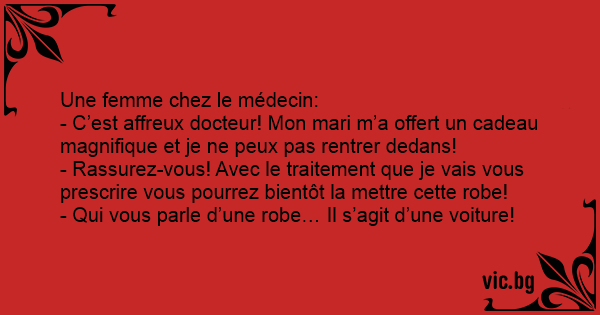 - C’est affreux docteur! Mon mari m’a offert un cadeau magnifique et je ne peux pas rentrer dedans!