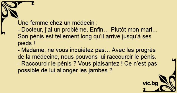 - Docteur, j’ai un problème. Enfin… Plutôt mon mari… Son pénis est tellement long qu’il arrive jusqu’à ses pieds !
