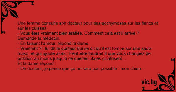 - Vraiment ?!, lui dit le docteur qui se dit qu’il est tombé sur une sado-maso, et qui ajoute alors : Peut-être faudrait-il que vous changiez de position au moins jusqu’à ce que les plaies cicatrisent…