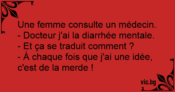 Une blonde va chez le médecin: - Docteur ? Je crois que J'ai la diarrhée mentale. - Pourquoi vous dites ça ? - Parce que à chaque fois que j'ai une idée, et bah c'est de la merde