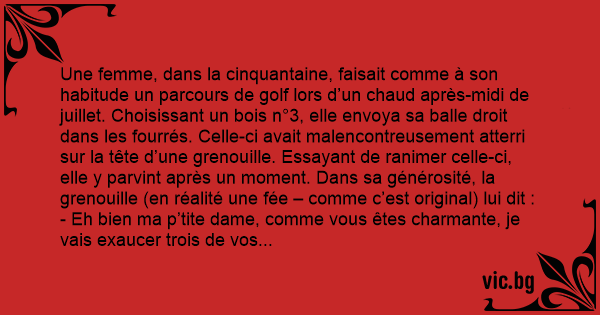 Une femme, dans la cinquantaine, faisait comme à son habitude un parcours de golf lors d’un chaud après-midi de juillet. Choisissant un bois n°3, elle envoya sa ваllе droit dans les fourrés. Celle-ci avait malencontreusement atterri sur la tête d’une grenouille. Essayant de ranimer celle-ci, elle y parvint après un moment. Dans sa générosité, la grenouille (en réalité une fée – comme c’est original) lui dit :