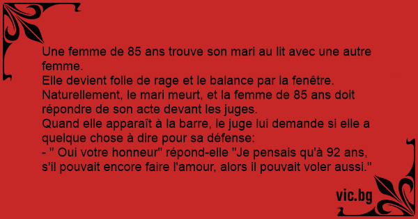 - " Oui votre honneur" répond-elle "Je pensais qu'à 92 ans, s'il pouvait encore faire l'amour, alors il pouvait voler aussi."