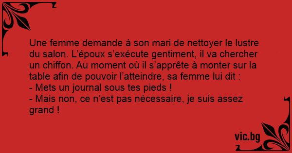 Une femme demande à son mari de nettoyer le lustre du salon. L’époux s’exécute gentiment, il va chercher un chiffon. Au moment où il s’apprête à monter sur la table afin de pouvoir l’atteindre, sa femme lui dit :