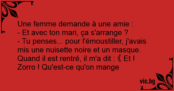 - Tu penses... pour l'émoustiller, j'avais mis une nuisette noire et un masque. Quand il est rentré, il m'a dit : 《 Et ! Zorro ! Qu'est-ce qu'on mange aujourd'hui ? 》