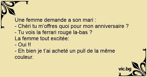 Un couple fait les magasins soudain l'homme demande à sa femme : - Dit chérie, tu vas m'offrir quoi pour mon anniversaire ? La femme surprise répond : - Tu vois la Ferrari rouge là bas ? Le mari...
