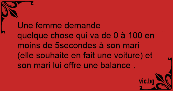 Une femme demande quelque chose qui va de 0 à 100 en moins de 5secondes à son mari (elle souhaite en fait une voiture) et son mari lui offre une balance .