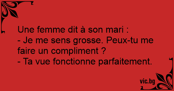 Une femme dit a son mari: - Cheri je me sens vieille, ridée et grosse. Fais moi un compliment. Le mari répond: - Tu sais quoi tu as une très bonne vue!