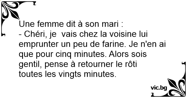 - Chéri, je vais chez la voisine lui emprunter un peu de farine. Je n'en ai que pour cinq minutes. Alors sois gentil, pense à retourner le rôti toutes les vingts minutes.