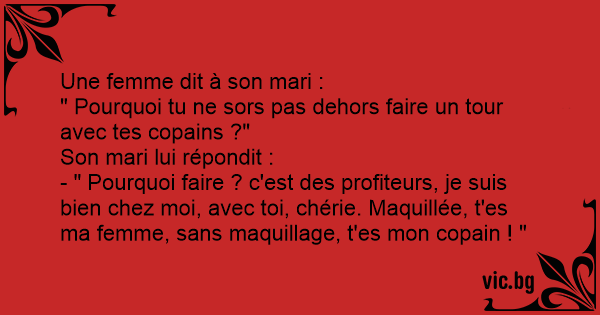 - " Pourquoi faire ? c'est des profiteurs, je suis bien chez moi, avec toi, chérie. Maquillée, t'es ma femme, sans maquillage, t'es mon copain ! "