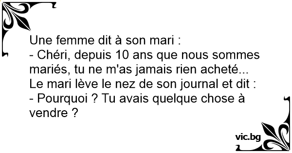 Une femme dit a son marie : - Tu te rends compte que nous somme marié depuis 7 ans, et tu ne m'as toujour rien acheté ?! - A bon, et qu'est ce que tu vends ?