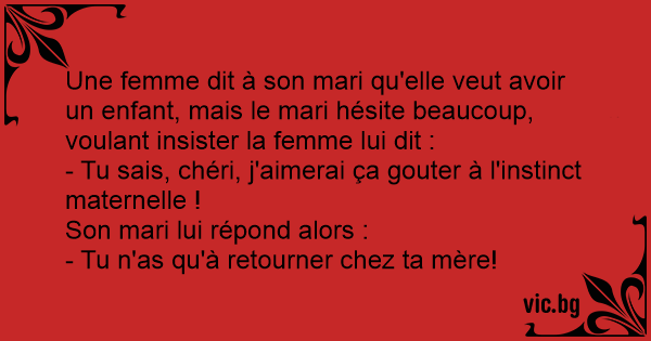 Une femme dit à son mari qu'elle veut avoir un enfant, mais le mari hésite beaucoup, voulant insister la femme lui dit :