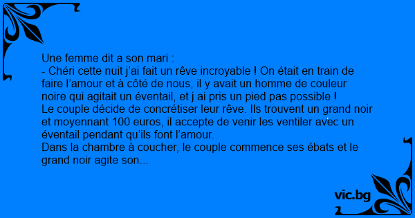 - Chéri cette nuit j’ai fait un rêve incroyable ! On était en train de faire l’amour et à côté de nous, il y avait un homme de couleur noire qui agitait un éventail, et j ai pris un pied pas possible !