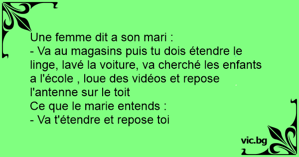 - Va au magasins puis tu dois étendre le linge, lavé la voiture, va cherché les enfants a l'école , loue des vidéos et repose l'antenne sur le toit