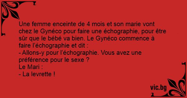 Une femme enceinte de 4 mois et son marie vont chez le Gynéco pour faire une échographie, pour être sûr que le bébé va bien. Le Gynéco commence à faire l’échographie et dit :