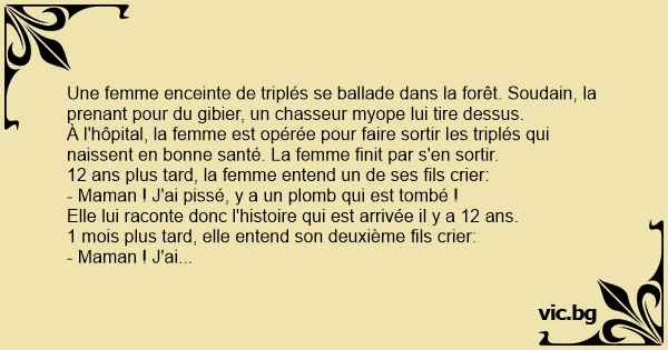 Une femme enceinte de triplés se ballade dans la forêt. Soudain, la prenant pour du gibier, un chasseur myope lui tire dessus.