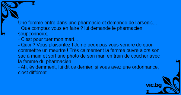 C'est un gars qui entre dans une pharmacie : - Je voudrais un litre d'arsenic. - Grands Dieux ! Pourquoi faire ? - Pour ma femme. - Ah... et euuuuh... Vous avez une ordonnance ? - Non mais je peux...