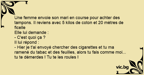 Une femme envoie son mari en course pour achter des tampons. Il reviens avec 5 kilos de coton et 20 mètres de ficelle