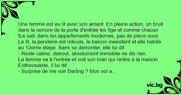 Une femme est au lit avec son amant. En pleine action, un bruit dans la serrure de la porte d'entrée les fige et comme chacun lLe sait, dans les appartements modernes, pas de place sous Le lit, la penderie est ridicule, le balcon inexistant et elle habite au 12eme étage. Sans se démonter, elle lui dit :