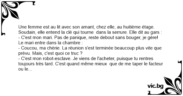 - C'est mon robot-esclave. Je viens de l'acheter, puisque tu rentres toujours très таrd. C'est quand même mieux que de me taper le facteur ou le voisin, non ?