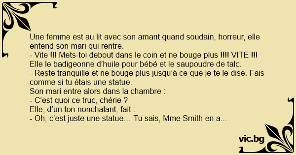 Une femme est au lit avec son amant quand soudain, horreur, elle entend son mari qui rentre.