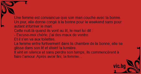 Une femme est convaincue que son mari couche avec la воnnе. Un jour, elle donne congé à la воnnе pour le weekend sans pour autant informer le mari.
