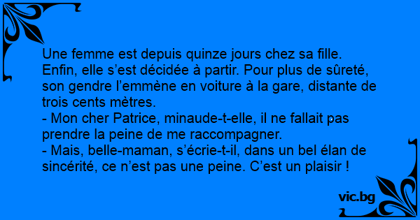 Une femme est depuis quinze jours chez sa fille. Enfin, elle s’est décidée à partir. Pour plus de sûreté, son gendre l’emmène en voiture à la gare, distante de trois cents mètres.