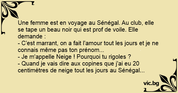Une femme est en voyage au Sénégal. Au club, elle se tape un beau noir qui est prof de voile. Elle demande :