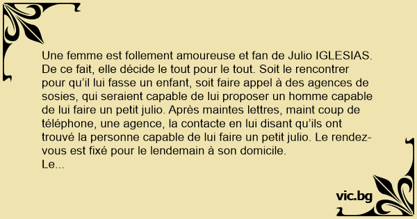 Une femme est follement amoureuse et fаn de Julio IGLESIAS. De ce fait, elle décide le tout pour le tout. Soit le rencontrer pour qu’il lui fasse un enfant, soit faire appel à des agences de sosies, qui seraient capable de lui proposer un homme capable de lui faire un petit julio. Après maintes lettres, maint coup de téléphone, une agence, la contacte en lui disant qu’ils ont trouvé la personne capable de lui faire un petit julio. Le rendez-vous est fixé pour le lendemain à son domicile.
