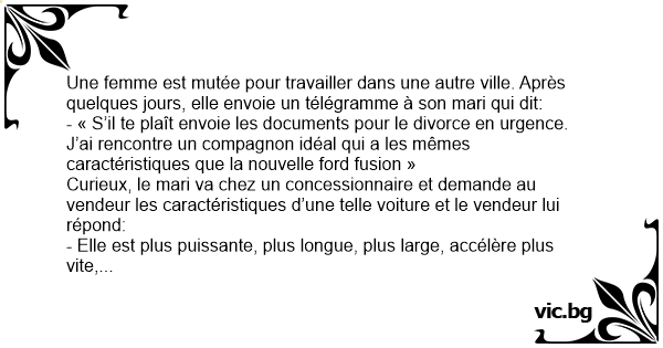- « S’il te plaît envoie les documents pour le divorce en urgence. J’ai rencontre un compagnon idéal qui a les mêmes caractéristiques que la nouvelle ford fusion »